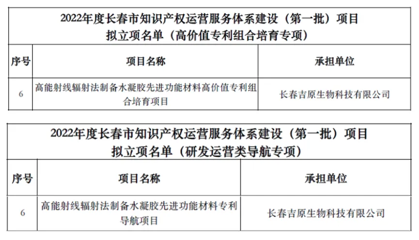 众志成城起宏图,公司年会胜利召开 2月3日,公司2022年度工作总结表彰暨2023年度工作动员大会在长春召开。年会以“重生、重构、重塑”为主题对企业未来五年的发展目标和路径进行规划和部署,即三年疫情后企业的重生、核心业务的重构、吉原水凝胶发展内核的重塑。公司股东代表、本部全员、营销中心和广州吉原康视公司管理层参加了本次大会。  促发展、抓落实,省市领导走访吉原生物公司 2月15日和2月22日,省委常委、长春市委书记张志军同志和长春市市长王子联同志先后来公司走访、考察,了解企业运行情况,现场解决企业发展中存在的困难与问题,并鼓励公司坚持创新引领,强化品牌宣传,不断开拓市场,努力抢占未来发展制高点。   聚焦医美市场,吉原美科(北京)公司成立 2月17日,由长春吉原生物公司与北京美科生物公司合资设立的吉原美科(北京)科技有限公司获颁营业执照。吉原美科公司专注于水凝胶材料在皮肤美容领域应用的深耕与持续发展,为广大求美者提供专业、安全、绿色的水凝胶材料解决方案。  增资扩股,省内知名投资机构入股吉原生物公司 3月下旬,长春吉原生物公司与吉林中科创投、吉林省科技投资、长春市股权投资、吉林省创新投等投资机构签署增资协议书。本次增资主要投向为水凝胶先进功能材料产业基地建设和软水凝胶、纳米水凝胶微球等重大项目的研发和若干新产品的产业化项目。  破土动工,吉原水凝胶产业基地项目开工建设 4月17日,吉林省2023年医药健康领域重大项目之一的吉原生物水凝胶材料产业基地举行开工仪式。长春市市委常委、常务副市长马延峰同志出席活动并宣布开工,长春市工信局、长春高新区领导报告了长春市医药健康领域重点项目建设情况。吉原生物水凝胶材料产业基地项目建设内容包括两台直线电子加速器、多条生产线、研发与检测实验室等,建成后将成为全球技术规模最大、设施最完善的水凝胶材料产业化平台。  苗冲高级工程师入选长春市高层次产业人才队伍 7月,苗冲高级工程师获颁“长春市生物医药产业高级研发人才”入选证书。这是继研发部部门经理于春暖高级工程师之后,我公司同事第二次获得该项荣誉。 苗冲高级工程师硕士毕业于吉林大学,现任公司研发部门副经理。  我司荣获“自创杯”创业大赛成长组一等奖 9月1日,由长春市科学技术局、长春新区管委会、长春净月高新区管委会联合举办的第二届长春“自创杯”创新创业大赛圆满收官。长春市委常委、长春市副市长赵建青,长春市人民政府副秘书长林继东等领导出席决赛活动现场。我司研发部杜婧高级工程师负责的“用于皮肤医疗美容的水凝胶敷料开发”项目参与成长组决赛,荣获一等奖。   建筑主体封顶,新厂区年度建设任务顺利完成。 10月26日,吉原水凝胶产业基地生产厂房和研发中心建筑主体封顶,2023年的新厂区建设目标圆满完成,为电子加速器等重大设备入场安装调试等后续工作的有序开展奠定了坚实的基础。新厂区计划于2024年下半年投入使用。  知识产权强企,提升创新发展动能 2023年,公司新申请专利24件,已授权和受理的水凝胶相关专利达60余项,涉及水凝胶材料合成方法、产品应用、工艺技术等多个方面。 公司承担的“高能射线辐射法制备水凝胶先进功能材料专利导航项目”和“高能射线辐射法制备水凝胶先进功能材料高价值专利组合培育项目”通过长春市知识产权运营服务体系建设项目的立项。吉原生物知识产权案例被评定为长春市企业知识产权优秀案例。   党建引领,促进企业高质量发展 2023年12月,吉原生物公司党支部连续两年荣获富强社区党委授予的“先进非公党组织”荣誉称号,公司党支部书记于春暖同志获评2023年度非公企业优秀党务工作者。